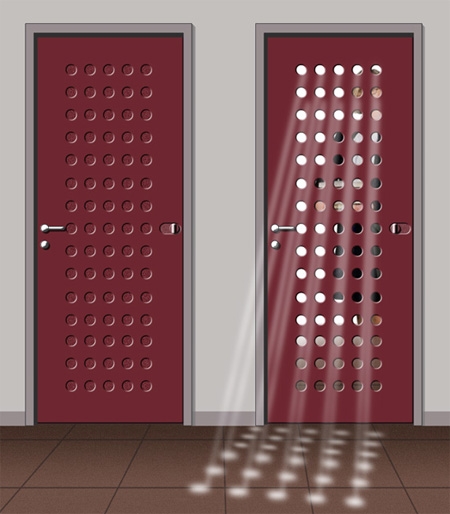 Mẫu cửa này sẽ nới rộng không gian nhà bạn, loại bỏ cảm giác tù túng, khép kín. Khi những chiếc lỗ nhỏ trên cánh cửa mở ra, căn phòng nhà bạn sẽ được cung cấp thêm ánh sáng và không khí cần thiết. Cửa vỡ tan
