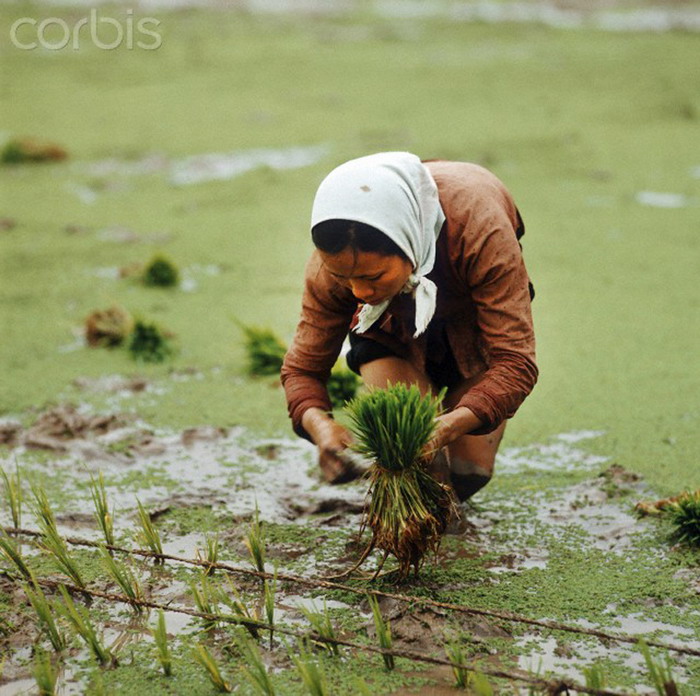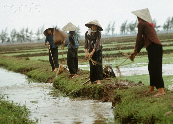Những người phụ nữ đội nón lá đang tham gia tát nước vào ruộng, một hình thức chuyên canh nông nghiệp truyền thống ở Việt Nam. Ảnh chụp tại tỉnh Nam Hà (cũ) năm 1973 của Werner Schulze-dpa-Corbis.