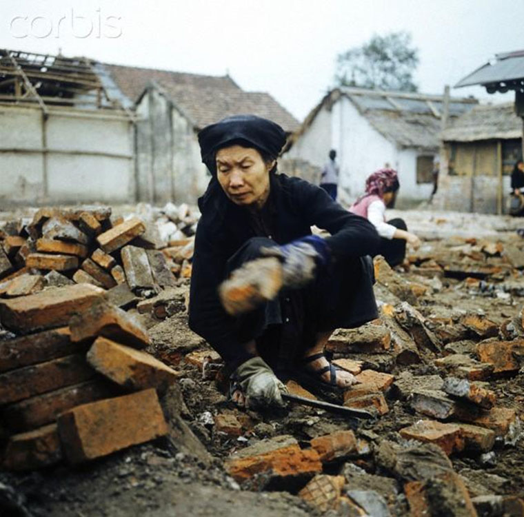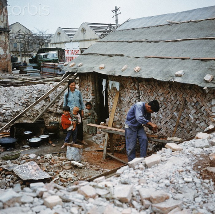 Căn nhà của gia đình người dân Hải Phòng bị phá hủy hoàn toàn năm 1973. Người chồng đang bào lại những mảnh gỗ có thể dùng lại được. Ảnh: Werner Schulze-dpa-Corbis.
