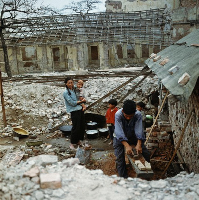 Khu phố Khâm Thiên sau đêm bị máy bay B52 của Mỹ oanh tạc 1 năm trước. Người dân nơi đây đang dựng lại con phố làm nên lịch sử của thành phố. (Ảnh chụp năm 1973)