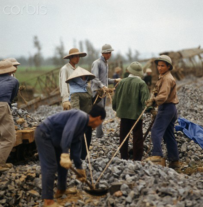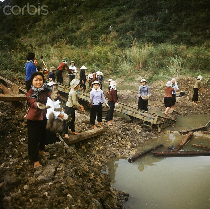 Những phụ nữ này đang làm công việc nối lại một cây cầu bị bom Mỹ phá hủy gần quốc lộ 1 đoạn thuộc địa phận Hà Nội, miền Bắc Việt Nam, 1973. Ảnh: Werner Schulze.