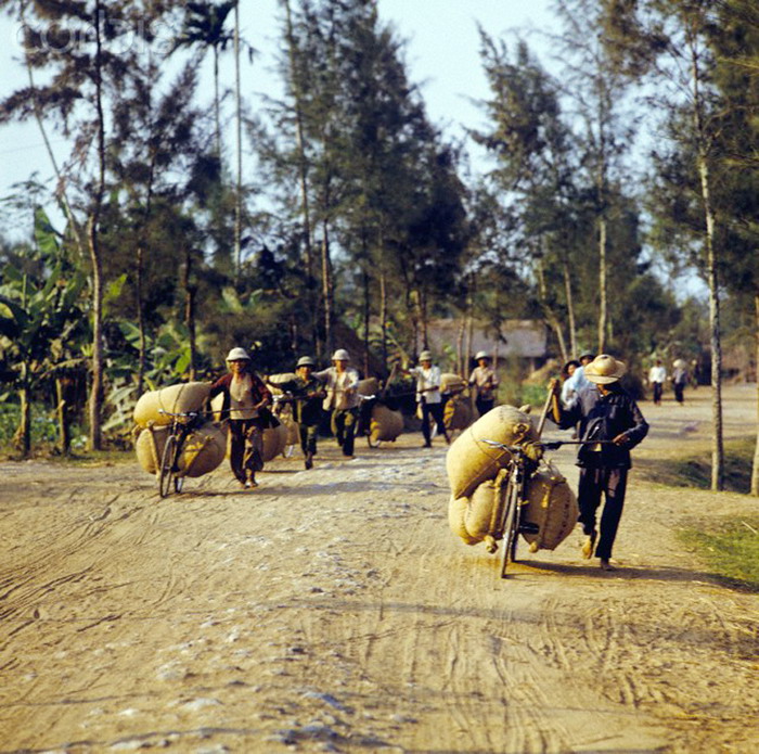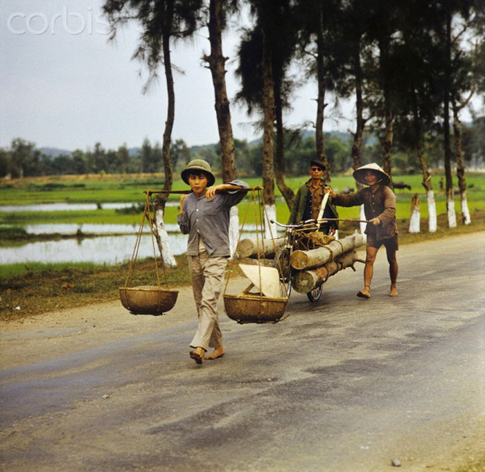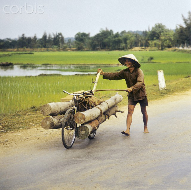 Vinh (3/1973), hai người đàn ông chở những cây gỗ trên chiếc xe đạp cải tiến, thanh niên đi trước thì gánh trên vai ở quốc lộ 1. Ảnh: Werner Schulze-dpa-Corbis