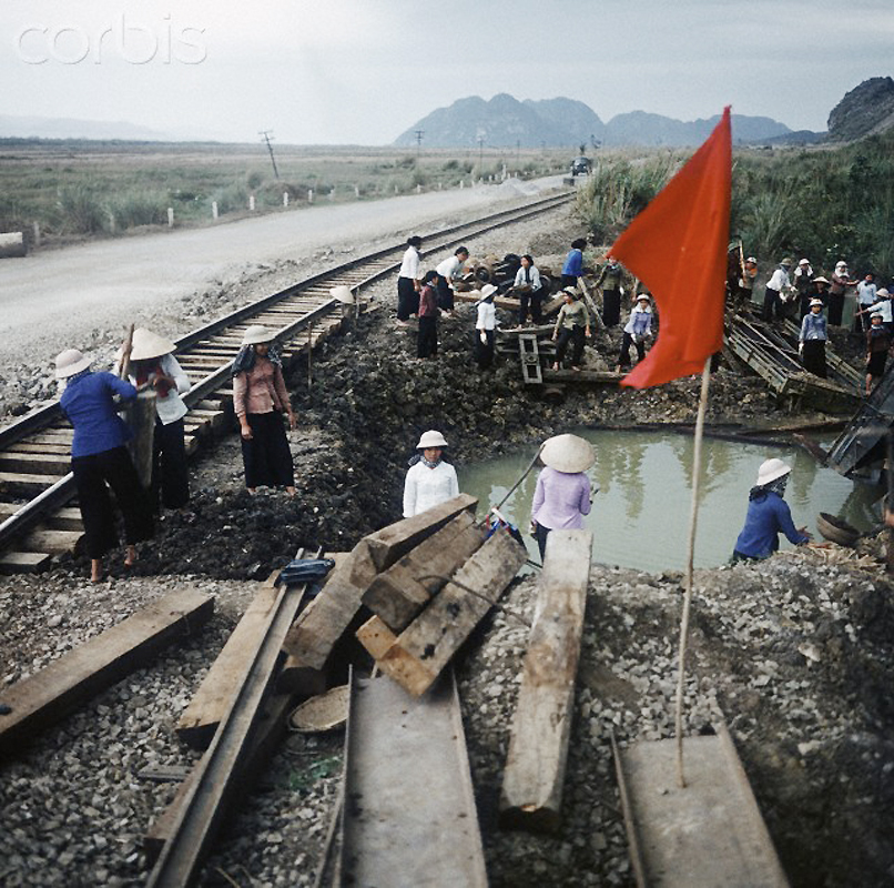 Hà Nội năm 1973, các nữ dân quân đang san lấp hố bom cạnh một đường ray tàu gần khu vực Hà Nội.