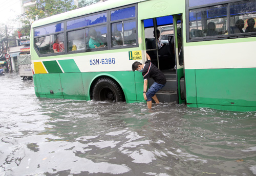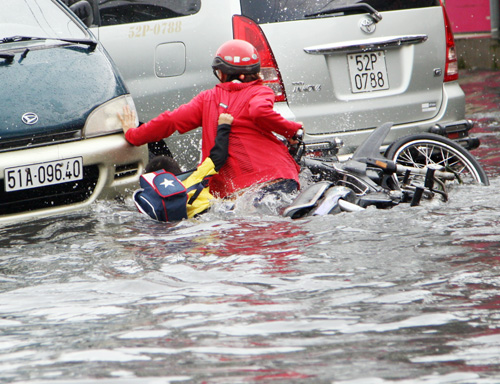 Sáng 9/10, nhiều người ngã nhào, ôtô thì chết máy, học sinh phải đi trên ghế vào lớp học... khi nhiều tuyến đường TP HCM lại biến thành sông sau cơn mưa lớn kéo dài.