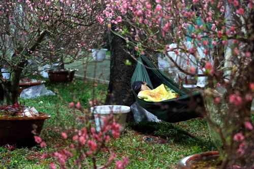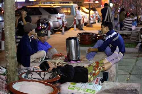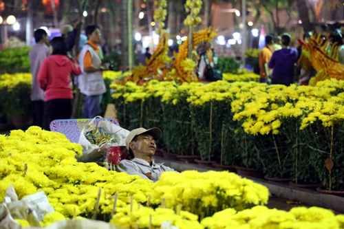 dễ dàng bắt gặp những người bán hoa Tết ngủ vùi giữa những chậu hoa,