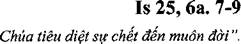 Ngài sẽ tiêụ diệt sự chết đến muôn đời. Chúa là Thiên Chúa sẽ lau sạch nước mắt trôn mọi khuôn mặt, và loại bỏ nỗi tủi hổ của dân Ngài khỏi toàn mặt đất, vì Chúa đã phán như vậy. Vào ngày ấy, ngưòi ta sẽ nói: “Đây Thiên Chúa chúng ta, chúng ta đã mong đọi Ngài để Ngài cứu độ chúng ta. Ngài là Chúa, Đấng chúng ta ừông đợi. Chúng ta hãy hân hoan và vui mừng trong ơn cứu độ của Ngài”. Đó là Lời Chúa.