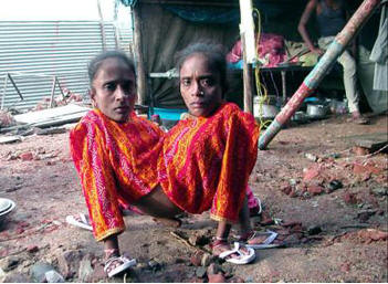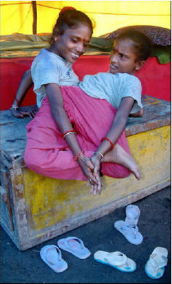 Ayara và Jayara Ratun chào đời năm 1970 tại thành phố Basirhat, bang Tây Bengal (Ấn Độ). Họ đổi tên thành Ganga và Jamuna Mondal (Ganga và Jamuna là 2 con sông hợp lưu được tôn thờ ở Ấn Độ) khi bước vào làng biểu diễn lúc còn bé xíu. Cặp chị em dính liền này có 2 trái tim, 4 tay nhưng chung nhau 3 chân, 2 quả thận, 1 buồng gan và đường sinh sản. Cái chân thứ 3 là chân thừa nên 2 chị em thường giấu nó vào trong quần áo.