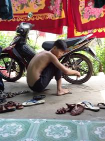 Chúng nó xúm lại lau chùi cái xe, lắc từng cái căm. Thng anh bảo thằng em: mang mấy hũ dầu nhớt ra đây cho anh. Phải đại tu cái xe lại nào. Vui quá !”