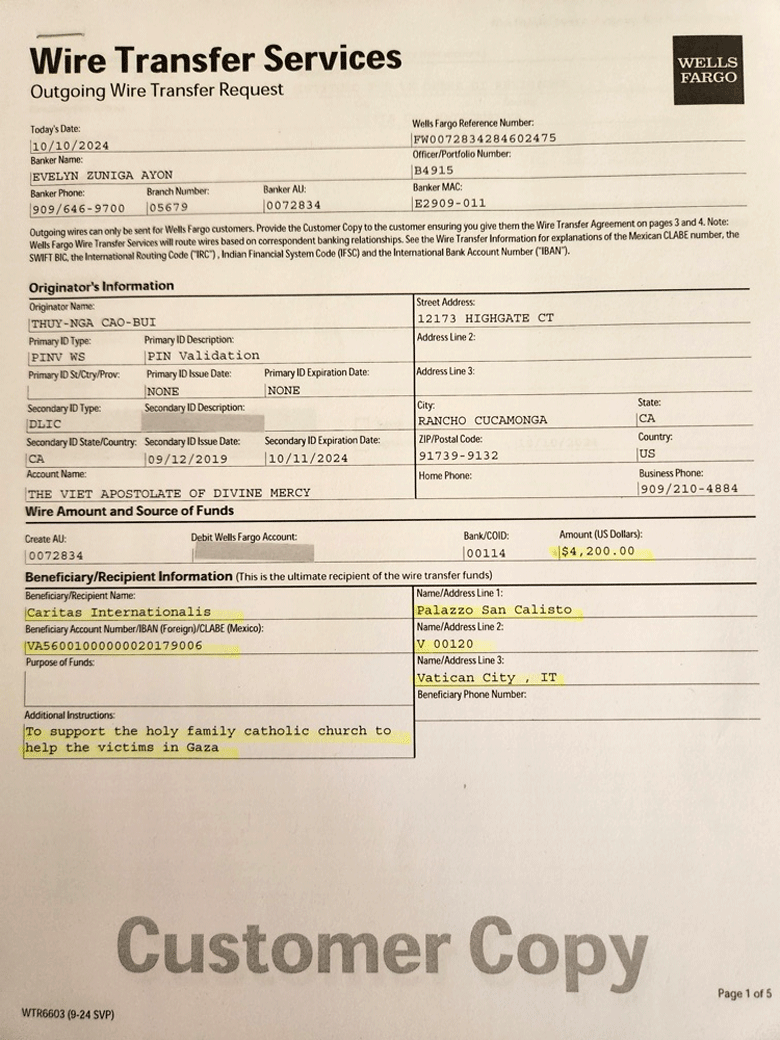 Như thế, tổng số tiền tạm thời cứu trợ Giáo xứ Thánh Gia ở Dải Gaza Thánh Địa là $4,200.00, số tiền chúng em đã chuyển ngân cho Caritas Internationalis sáng nay 10/10/2024.