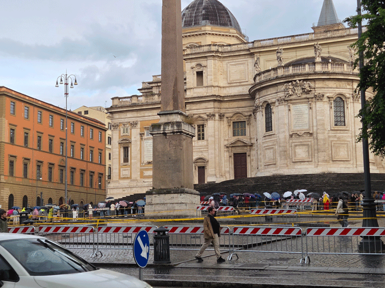 Chiều hôm nay, Thứ Hai 28/4, vẫn bị mưa, chúng tôi vẫn chưa thể vào bên trong. Vì chúng tôi còn ở Roma cho đến hết Tuần Cửu Nhật Giáo Hội cầu cho ngài (26/4 - 4/5/2025) để Hành Hương Năm Thánh Lữ Hành Hy Vọng ở Roma và gần Roma, vẫn còn cơ hội để viếng mộ ngài khi có thể trước khi về Mỹ ngày 5/5/2025. Nhưng chính cơn mưa mà hôm nay chúng tôi ghé đến Đền Thờ Đức Bà Cả này lại càng cho thấy tấm lòng của cộng đồng Dân Chúa mộ mến vị Giáo Hoàng Thương Xót Phanxicô có lòng biệt tôn Đức Mẹ này đến như thế nào, ở chỗ như đã xếp hàng viếng xác ngài ở Đền Thờ Thánh Phêrô trong 3 ngày được phép, lại sẵn sàng đội mưa chịu lạnh che dù xếp hàng dài để được vào viếng mộ của ngài, như hình ảnh và video cho thấy dưới đây: