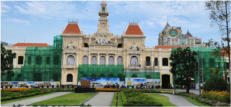 Tòa Đô Chánh Sài Gòn ở đầu đường Nguyễn Huệ, con đường biến thành khu chợ hoa vào những ngày trước tết và cũng là con đường đâm thẳng ra Bến Bạch Đằng.