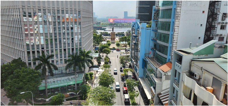 Tòa Nhà Quốc Hội ở đầu đường Lê Lợi và đằng sau là đường Hai Bà Trưng, và đường Lê Lợi băng ngang qua đường Nguyễn Huệ rồi kéo dài xuống Chợ Bến Thành.