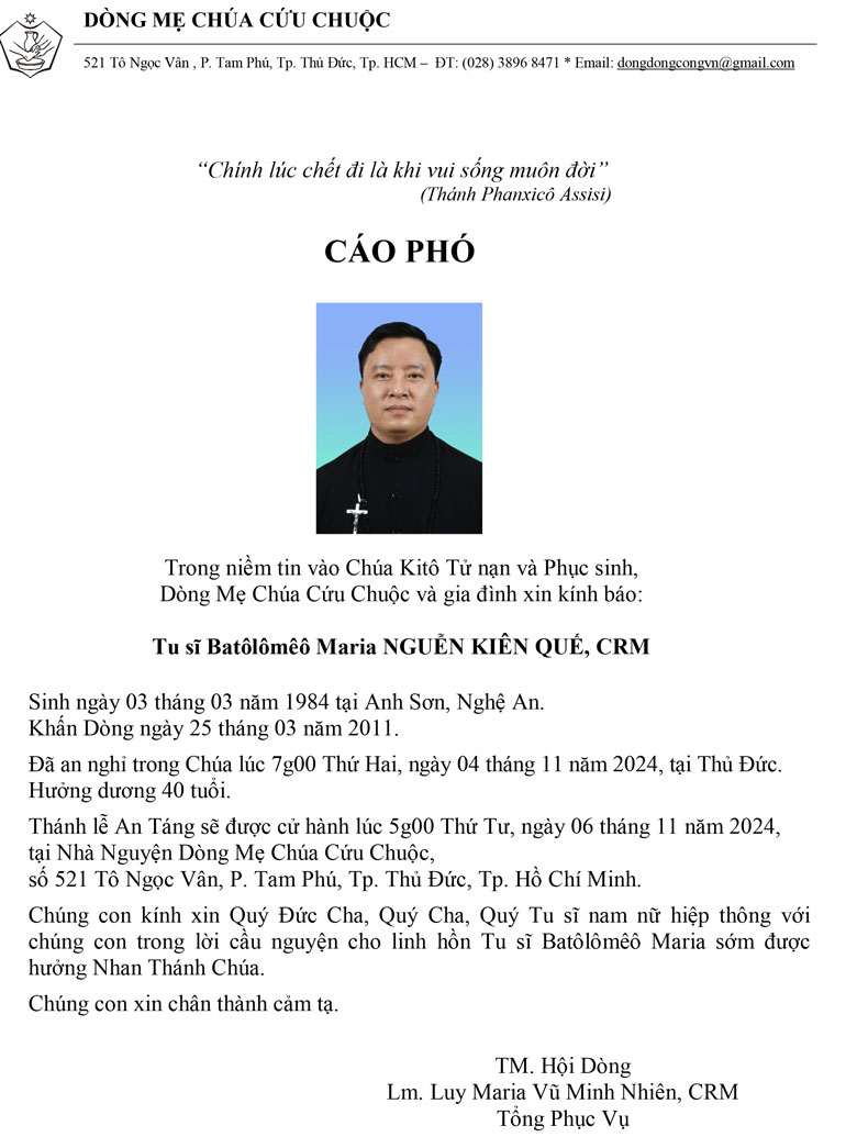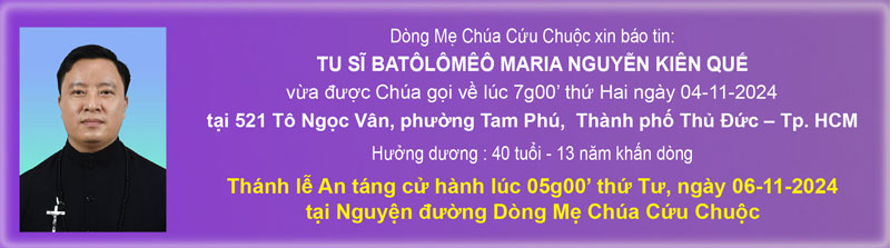 THĐC xin chúc mừng cùng thành kính hiệp thông với anh em Dòng cầu nguyện cho LH người anh Batolomeo Maria Nguyễn Kiên Quế, CRM được sớm trọn vẹn hiệp thông thần linh vĩnh phúc.