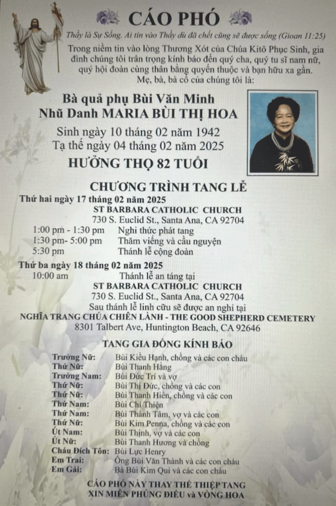 THĐC Nam California sẽ đến tham dự hậu sự và hiệp thông chị cùng tang gia cầu nguyện cho LH Maria mẹ của chị từ 3 đến 4 giờ chiều.
