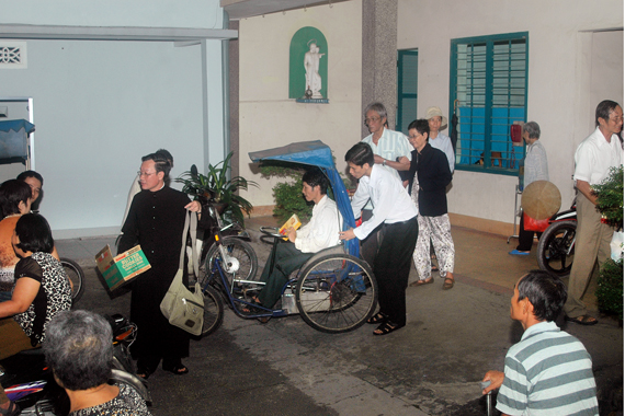 Để nâng đỡ đời sống tinh thần cho các người khuyết tật, những người bị bệnh kinh niên già cả, Ban Bác Ái Xã Hội Đồng Công hằng tuần có tổ chức một Thánh Lễ dành riêng cho họ vào 16 giờ 45 chiều Thứ Bảy. Thánh Lễ cũng tụ tập được khoảng 300 người kể cả người gia đình đi theo. Thánh Lễ là bữa tiệc tinh thần thật cần thiết để cung cấp cho họ sức chịu đựng được những đau đớn của thân xác và đau khổ của tâm hồn. Trong số những bệnh nhân này có một em khuyết tật mà chiều Thứ Bảy nào gia đình cũng phải chở em đi dự lễ. Thứ Bảy nào mà gia đình ngăn trở không thể đưa em đi dự lễ được thì ngày đó bệnh của em lên cơn, vì thế, với bất cứ giá nào cũng phải đưa em đi đự lễ. Kèm theo với những Thánh Lễ được dâng lên để nuôi sống đời sống tinh thần, Ban BAXH cũng thường phát quà cho họ trong những dịp đặc biệt như Lễ Quan Thầy: Các Thánh TĐVN, Giáng Sinh, … và uống nước sau Thánh Lễ. Đây là dịp cách bệnh có thời giờ gặp gỡ nhau và với quí cha, quí thầy. |