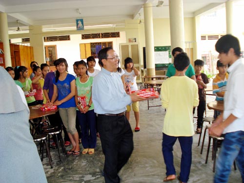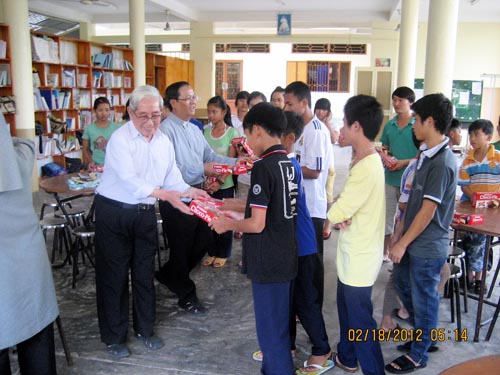 đi thăm viếng và tặng quà cho các trung tâm mồ côi, phong cùi và khuyết