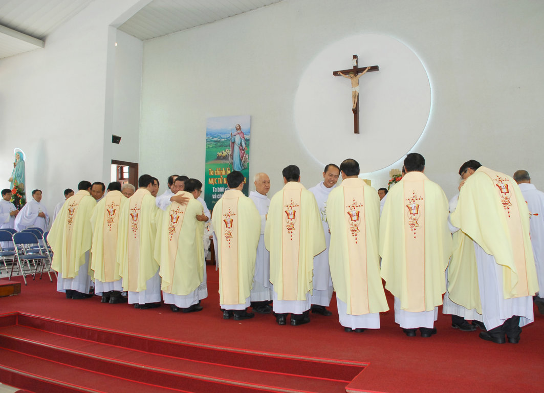 Đúng 8 giờ 30 sáng, ngày 25-10-2014 tại nguyện đường chính của Dòng Đức Mẹ Đồng Công, đã diễn ra lễ truyền chức linh mục cho 9 tu sĩ của Dòng. Chủ sự thánh lễ truyền chức hôm nay là Đức Tổng Giám Mục Phaolô Bùi Văn Đọc – Tổng Giám Mục Sài Gòn. Cùng đồng tế với Đức Cha Phaolô có Cha Đặc trách dòng tu, quý Cha đan trưởng, quý Cha giáo, quý Cha khách và đông đảo linh mục của Dòng. Tổng cộng có khoảng hơn 100 linh mục đồng tế, đông đảo các tu sĩ nam nữ, thân nhân và ân nhân của các vị tiến chức tham dự. Mở đầu Thánh Lễ, Đức Tổng Giám Mục Phaolô ngỏ lời chào Cha Tổng Phục vụ và toàn thể anh em Dòng Đồng Công. Ngài mời gọi cộng đoàn xin Chúa chúc phúc cho cộng đoàn, đặc biệt cho những thầy nhận lãnh tác vụ linh mục hôm nay. Trong phần huấn dụ, Đức Tổng Giám Mục đã chia sẻ với cộng đoàn tham dự thánh lễ truyền chức. Ngài nói: "Linh mục, dù là linh mục triều hay dòng, đều là sứ giả của Thiên Chúa, được Thiên Chúa sai đi để nói điều mà Thiên Chúa muốn nói cho chư dân; chính vì thế linh mục phải là người thấm nhuần Lời Chúa. Linh mục là người loan Tin Mừng của Chúa, rao giảng về Chúa Giêsu Kitô, Đấng đã hy sinh trên thập giá để cứu chuộc loài người, với sự cộng tác chặt chẽ của Mẹ Maria. Linh mục là người mục tử nhân lành, là người phục vụ. Về điểm này, Đức Tổng cảnh báo về ba cám dỗ lớn nhất của đời linh mục, đó là: quyền lực, hưởng thụ, và cám dỗ nghịch đức trong sạch". Như vậy, linh mục là một chức vụ vừa rất cao cả, nhưng cũng là một nhiệm vụ đầy thử thách. Vì thế linh mục cần có sức mạnh của Chúa Thánh Thần, cần nhiều lời cầu nguyện của cộng đoàn. Thánh lễ diễn ra trong bầu không khí trang nghiêm, sốt sắng. Lần lượt từng Tiến chức tiến lên để Đức Tổng Giám Mục đặt tay truyền chức thánh, trong sự hân hoan chúc phúc của cộng đoàn tham dự. Trước khi Thánh Lễ kết thúc, Cha Tổng Phục vụ Piô Maria, đại diện Hội Dòng cám ơn Đức Tổng Giám Mục Phaolô, vị chủ chăn mới của giáo phận, đã đem đến cho hội dòng niềm vui lớn lao qua việc Ngài ban tác vụ thánh cho những tu sĩ của Hội Dòng. Cha Tổng Phục vụ cũng cám ơn quý Cha, quý bề trên, quý tu sĩ nam nữ, quý khách và cộng đoàn phụng vụ đã đến hiệp dâng Thánh Lễ, cầu nguyện và chia sẻ niềm vui với các tân linh mục. Thánh Lễ truyền chức khép lại lúc 10 giờ 25 với giai điệu hân hoan của bài ca tạ ơn. Bài hát nói lên tâm tình tạ ơn Thiên Chúa vì hồng ân Ngài đã thương ban cho 9 tân linh mục, cho thân nhân của tân chức, cho toàn thể Hội Dòng. Xin được dâng lời cảm tạ Hồng Ân Thiên Chúa đã ban thêm cho Giáo Hội Việt Nam những vị chủ chăn. Xin được cùng hiệp lời cầu nguyện trong tâm tình nguyện xin cho các tân chức luôn vững tâm và thánh thiện trong thiên chức mà Thiên Chúa đã đặt để và trao phó. | ||||||