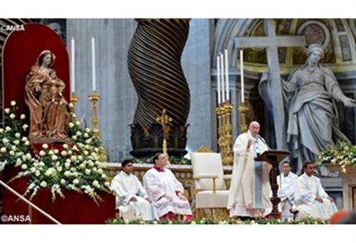 Sáng ngày 1-1-2015, ĐTC Phanxicô đã chủ sự thánh lễ trọng thể tại Đền thờ Thánh Phêrô, kính Đức Maria là Mẹ Thiên Chúa, cũng là Ngày Hòa bình thế giới lần thứ 48. Đồng tế với ĐTC có khoảng 30 Hồng Y và hơn 40 GM thuộc các cơ quan trung ương Tòa Thánh và hàng trăm linh mục, trước sự hiện diện của 9 ngàn tín hữu, trong đó có nhiều vị đại sứ các nước. Tháp tùng ĐTC trên bàn thờ có ĐHY Quốc vụ khanh Tòa Thánh Pietro Parolin, và vị Phụ tá là Đức TGM Angelo Becciu, Đức TGM Dominique Mamberti, ngoại trưởng Tòa Thánh tân chủ tịch Tối cao pháp viện, ĐHY Peter Turkson, Chủ tịch Hội đồng Tòa Thánh Công lý hòa bình, và vị Tổng thư ký là Đức Cha Mario Toso, dòng Don Bosco. Bài giảng của ĐTC Trong bài giảng thánh lễ, ĐTC quảng diễn mối liên hệ đặc biệt giữa Chúa Giêsu và Mẹ Maria, và từ đó nói đến quan hệ giữa Chúa Kitô và Giáo Hội cũng là Mẹ chúng ta. Ngài nói: ”Khi cử hành lễ trọng kính Đức Maria cực thánh là Mẹ Thiên Chúa, Giáo Hội nhắc nhớ chúng ta rằng Mẹ Maria là người đầu tiên nhận lãnh phúc lành như được nói đến trong bài đọc thứ I trích từ sách Dân Số (Ds 6,24-26). Nơi Mẹ, lời chúc lành được viên mãn: thực vậy, không có thụ tạo nào đã thấy tôn nhan Chúa chiếu tỏa trên mình như Mẹ Maria, Mẹ đã mang khuôn mặt nhân trần cho Ngôi Lời Vĩnh Cửu, để tất cả chúng ta có thể chiêm ngưỡng. ”Ngoài việc chiêm ngưỡng tôn nhan Chúa, chúng ta cũng có thể chúc tụng và tôn vinh Ngài, giống như những người chăn chiên, từ Bêlem trở về, ca hát cảm tạ sau khi đã được thấy Hài Nhi và người Mẹ trẻ của Ngài (Xc Lc 2,16). Hai Đấng ở cùng nhau, như trên Đồi Canvê sau này, vì Chúa Kitô và Mẹ Ngài không thể tách rời nhau: giữa hai vị có một quan hệ rất mật thiết, cũng như giữa mỗi người con và người mẹ. Thân mình Chúa Kitô - là nguyên lý nền tảng ơn cứu độ chúng ta (Tertulliano) - đã được hình thành trong cung lòng Mẹ Maria (Xc Tv 139,13). Sự bất khả phân ly cũng được biểu lộ qua sự kiện Mẹ Maria được tuyển chọn trước để làm Mẹ Đấng Cứu Thế, Mẹ đã chia sẻ trọn vẹn toàn thể sứ mạng của Chúa, ở cạnh Chúa Con cho đến lúc cuối cùng trên đồi Canvê. Mẹ Maria được liên kết với Chúa Giêsu đến độ nhận được từ nơi Chúa tri thức tâm hồn, tri thức đức tin, được nuôi dưỡng bằng kinh nghiệm hiền mẫu và nhờ mối liên hệ thân mật mới Chúa Con. Đức Thánh Trinh Nữ, là phụ nữ đức tin, đã dành chỗ cho Thiên Chúa trong tâm hồn và trong các dự phóng của Mẹ; Mẹ là người tín hữu có khả năng đón nhận nơi hồng ân Chúa Con biến cố thời gian sung mãn (Gl 4,4), trong đó Thiên Chúa, khi chọn con đường khiêm hạ là cuộc cuộc sống nhân trần, đã đích thân đi vào lịch sử cứu độ. Vì thế ta không thể hiểu được Chúa Giêsu mà không để ý đến Mẹ Ngài. ĐTC giải thích rằng: ”Chúa Kitô và Giáo Hội cũng không thể tách rời nhau, và ta không thể hiểu ơn cứu độ do Chúa Giêsu mang lại nếu không để ý đến tình mẫu tử của Giáo Hội. Tách rời Chúa Giêsu ra khỏi Giáo Hội là muốn du nhập một sự chia cách vô lý, như chân phước Phaolô 6 đã viết (Xc Evang. nunt. 16). Không thể yêu mến Chúa Kitô mà không yêu mến Giáo Hội, không thể nghe Chúa Kitô mà không nghe Giáo Hội, không thể thuộc về Chúa Kitô mà lại ở ngoài Giáo Hội” (Ib.). Thực vậy chính Giáo Hội, là đại gia đình của Thiên Chúa, đưa Chúa Kitô đến cho chúng ta. Đức tin của chúng ta không phải là một đạo lý trừu tượng hay một triết lý, nhưng là quan hệ sinh động và trọn vẹn với một nhân vật là Chúa Giêsu Kitô, Con duy nhất của Thiên Chúa làm người, chịu chết và sống lại để cứu độ chúng ta và sống giữa chúng ta. Vậy chúng ta có thể gặp Ngài ở đâu? Thưa chúng ta gặp ngài trong Giáo Hội. Chính Giáo Hội nói với chúng ta ngày nay: ”Đây là Chiên Thiên Chúa”, Giáo Hội loan báo Chúa, và chính trong Giáo Hội mà Chúa Giêsu tiếp tục thực hiện những cử chỉ ơn thánh là các bí tích. ”Hoạt động và sứ mạng này của Giáo Hội biểu lộ tình mẫu tử của Giáo Hội. Thực vậy Giáo Hội như một người mẹ dịu dàng gìn giữ Chúa Giêsu và trao Chúa cho tất cả mọi người trong niềm hân hoan và quảng đại. Không có sự biểu lộ nào của Chúa Giêsu, dù là huyền bí nhất, có thể tách rời khỏi mình và máu của Giáo Hội, khỏi đặc tính cụ thể lịch sử của Mình Chúa Kitô. Không có Giáo Hội, thì Chúa Giêsu Kitô rốt cục bị thu hẹp thành một ý tưởng, một nền luân lý, một tình cảm. Không có Giáo Hội, thì tương quan của chúng ta với Chúa Kitô tùy thuộc sự tưởng tượng, những giải thích và tính khí nhất thời của chúng ta. Và ĐTC kết luận rằng: ”Anh chị em thân mến, Chúa Giêsu Kitô là phúc lành cho mỗi người và toàn thể nhân loại. Giáo Hội, khi ban Chúa Giêsu cho chúng ta, thì cũng trao tặng cho chúng ta phúc lành viên mãn của Chúa. Đây chính là sứ mạng của dân Chúa: sứ mạng chiếu tỏa phúc lành của Thiên
