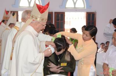 cũng trở về thăm “cố hương”. Nghi thức chào mừng Khi đoàn xe đưa Đức hồng y Filoni đi thăm Hưng Hoá đến Nhà thờ Hoà Bình lúc 8g30 thì các tín hữu đã ngồi kín ngôi thánh đường rộng 1.200m2 (sức chứa 3.000 chỗ) và đứng tràn ra rất đông bên ngoài quảng trường rộng 6.500m2, bất chấp gió lạnh và sương mù nơi vùng trung du. Đức hồng y Bộ trưởng dang rộng hai tay tươi cười chào các tín hữu. Ngài hôn thánh giá trước cửa nhà thờ, rảy nước thánh trên dân Chúa, rồi tiến lên cung thánh quỳ cầu nguyện trước Mình Thánh Chúa. Sau đó, phái đoàn ra ngồi trên lễ đài tại sân Nhà thờ. Nghi thức chào mừng bắt đầu với diễn từ của Đức cha Gioan Maria Vũ Tất. Ngài diễn tả niềm vui được đón vị Bộ trưởng Bộ Truyền giáo, rồi trình bày quá khứ cùng với hiện tình của giáo phận Hưng Hoá. Giáo phận được thành lập năm 1895 với tên gọi Hạt đại diện Tông toà Thượng Du Bắc Kỳ (Đoài), rồi đổi tên thành Hưng Hoá vào năm 1924, sau đó trở thành giáo phận chính toà Hưng Hoá vào năm 1960. Giáo phận này hiện nay trải rộng trên địa bàn 10 tỉnh (Hà Tây nay thuộc về Hà Nội, Phú Thọ, Hoà Bình, Yên Bái, Lào Cai, Tuyên Quang, Hà Giang, Sơn La, Lai Châu, Điện Biên), diện tích khoảng 54.500 km2 với 235.000 tín hữu trong 95 giáo xứ và hơn 570 giáo họ, chiếm 3,9% dân số của toàn vùng Tây Bắc Việt Nam. Trải qua nhiều khó khăn nhưng đến nay, con số linh mục và tu sĩ đã tăng gấp bốn lần. Dù vậy vẫn chưa đủ để mỗi giáo xứ có một linh mục thường trú nhằm đáp ứng tại chỗ nhu cầu mục vụ cho giáo dân. Việc đào tạo giáo dân (làm giáo lý viên, cộng tác viên điều hành giáo xứ, huấn luyện các tín hữu ưu tú nhất là trong hàng ngũ giới trẻ) do đó, trở thành việc thiết yếu sống còn, để có nhân sự cộng tác đắc lực trong công cuộc Phúc Âm hoá. Hiện nay, giáo phận Hưng Hoá có 85 linh mục (75 cha triều và 10 cha dòng); 110 đại chủng sinh, 63 tiền chủng sinh, 60 tu sinh theo đuổi ơn gọi linh mục, 6 nữ tu dòng Thánh Phaolô thành Chartres, 6 nữ tu dòng Con Đức Mẹ Phù hộ, 270 chị em dòng Mến Thánh giá với 45 tập sinh và 130 đệ tử; 3.030 giáo lý viên. Từ năm 2006, tại ba tỉnh miền núi Sơn La, Lai Châu, Điện Biên, những hoạt động tôn giáo mới bắt đầu được triển khai trở lại. Mặc dù cộng đoàn gặp nhiều khó khăn, con số tân tòng ở dân tộc miền núi vẫn không ngừng gia tăng. Ở những nơi này, chính quyền chưa công nhận một giáo xứ hoặc giáo họ nào, nhưng kể từ đầu năm 2015, đã có những dấu hiệu cải thiện trong quan hệ đối thoại với chính quyền dân sự tại ba tỉnh vừa nêu. Sau phần phát biểu của Đức cha Vũ Tất, cha sở Giuse Nguyễn Trung Thoại đã giới thiệu về giáo xứ Hoà Bình của mình. Ngay từ năm 1993, Toà Giám mục Hưng Hoá đã cử cha Giuse Nguyễn Trung Thoại đến Hoà Bình tìm kiếm những giáo dân vẫn âm thầm sống đức tin trong gia đình để quy tụ thành cộng đoàn. Đến năm 2000, tỉnh Hoà Bình đồng ý cho cha Thoại về thăm mục vụ giáo dân, và vào ngày 1/11/2002, cha Thoại được phép cử hành Thánh lễ sau 56 năm vắng bóng Thánh lễ tại đây. Ngày 17/8/2012, Thánh lễ đặt viên đá đầu tiên của nhà thờ giáo xứ Hoà Bình đã được tổ chức, và vào ngày 21/11/2014, ngôi thánh đường “Kính Lòng Chúa thương xót” của giáo xứ Hoà Bình đã được thánh hiến. Hiện nay giáo xứ Hoà Bình có 3.500 giáo dân với 11 giáo họ. Có lẽ đây là giáo xứ rộng nhất ở Việt Nam hiện nay, vì trải dài tới 160 km thuộc 5 huyện (Kỳ Sơn, Cao Phong, Tân Lạc, Mai Châu, Đà Bắc) và thành phố Hoà Bình. Hằng năm có thêm khoảng 400-500 anh chị em tân tòng. Trong phần đáp từ, Đức hồng y Filoni đã mô tả những tâm tình tha thiết của Đức giáo hoàng Phanxicô dành cho Việt Nam, và mời gọi mọi người cầu nguyện để vượt qua những khó khăn. Tiếp theo là tiết mục văn nghệ chào đón đậm đà màu sắc dân tộc do các nữ tu Dòng Mến Thánh Giá Hưng Hoá trình diễn. Thánh lễ và các bí tích Khai tâm Thánh lễ vào lúc 10g đã diễn ra bên trong Thánh đường, được các hồng y, giám mục và rất đông linh mục cử hành thật sốt sắng. Trong bài giảng lễ, Đức hồng y Bộ trưởng một lần nữa mời gọi mọi tín hữu miệt mài cầu nguyện và coi Giáo hội như là gia đình thân thương của mình, đồng thời tích cực loan báo Tin Mừng. Sau đó là một nghi thức hết sức ấn tượng: các hồng y và các giám mục đã cử hành các bí tích Rửa tội và Thêm sức cho 172 tân tòng người H’Mông, Mường, Dao và Thái. Trước khi kết thúc thánh lễ, Đức hồng y Fernando Finoli đã chúc mừng các thành viên mới của Giáo hội vừa lãnh nhận các bí tích khai tâm. Ngài tặng chiếc áo lễ đang mặc cho giáo xứ Hoà Bình, để “chứng tỏ tôi vẫn hiện diện giữa anh chị em”. Ngài cũng chuyển phép lành của Đức Thánh Cha cho mọi người để “anh chị em đem về gia đình, và được hạnh phúc, bình an”. Thánh lễ kết thúc lúc 11g45. Phái đoàn của Đức hồng y Filoni đã 