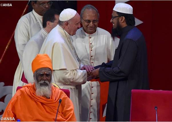 WHĐ (14.01.2015) – Ngày thứ nhất trong chuyến tông du của Đức Thánh Cha Phanxicô đến Sri Lanka đã kết thúc với cuộc gặp gỡ các đại diện các tôn giáo tại Trung tâm Hội nghị quốc tế BMICH ở Colombo diễn ra vào lúc 18g15 thứ Ba 13-01. Các cộng đồng tôn giáo chính ở Sri Lanka là Phật giáo (70% dân số), Ấn giáo (12,6%), Hồi giáo (9,7%) và Công giáo (7,16%). Theo dòng lịch sử, Ấn giáo là tôn giáo chính tại đảo quốc này cho đến khi các nhà truyền đạo Phật giáo xuất hiện vào thế kỷ thứ ba trước Công nguyên; hiện nay các tín đồ Ấn giáo sống tập trung ở khu vực phía bắc và phía đông Sri Lanka, và phần lớn thuộc sắc tộc Tamil. Phật Giáo nguyên thủy đến đảo quốc này vào khoảng năm 246 trước Công nguyên, và được tuyên bố là quốc giáo vào khoảng năm 200 trước Công nguyên; từ giữa thế kỷ XIX trở đi, Phật giáo được hồi sinh nhờ các phong trào ái quốc. Từ thế kỷ XV, Hồi giáo được truyền bá nhờ các thương gia Ả Rập, họ kiểm soát các tuyến đường thương mại ở Nam Ấn Độ Dương, cho đến khi các nhà thừa sai Phanxicô xuất hiện cùng với người Bồ Đào Nha. Truyền thống nói rằng Thánh Tôma đã đặt chân lên đảo vào thế kỷ thứ I sau khi vượt qua Kerala ở miền nam Ấn Độ. Tuy nhiên, các tài liệu sớm nhất của Kitô giáo trên đảo quốc này có niên đại 1322, khi tu sĩ Phanxicô Odorico da Pordenone đến ở đây một thời gian ngắn, và sau đó từ năm 1517, có các nhà thừa sai Phanxicô. Khoảng một ngàn đại biểu các cộng đồng tôn giáo khác nhau (Phật giáo, Ấn giáo, Hồi giáo và các hệ phái Kitô giáo) đã chào đón Đức Thánh Cha Phanxicô tại Hội trường BMICH. Cuộc gặp gỡ mở đầu với bài tụng kinh cầu an Pirith của Phật giáo, tiếp theo là lời cầu phúc của Ấn giáo, của Hồi giáo và lời cầu nguyện của nhóm đại kết. Sau phát biểu chào mừng của Hoà thượng Vigithasiri Niyangoda Thero là diễn văn của Đức Thánh Cha Phanxicô. Đức Thánh Cha khẳng định Giáo hội vẫn luôn rất tôn trọng các tôn giáo khác, và ngài nhắc lại rằng, muốn có hoà bình, không bao giờ được lợi dụng niềm tin tôn giáo để biện minh cho bạo lực và chiến tranh.