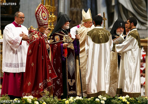 VATICAN. Chúa Nhật 12-4-2015, ĐTC Phanxicô đã chủ sự thánh lễ tại Đền thờ Thánh Phêrô nhân dịp tưởng niệm biến cố đau thương: 100 năm cuộc tiêu diệt gần 1 triệu 500 ngàn người Arméni do đế quốc Ottoman Thổ Nhĩ Kỳ. Trong thánh lễ ngài cũng tôn phong thánh Gregorio Nazek người Armeni làm Tiến Sĩ Hội Thánh