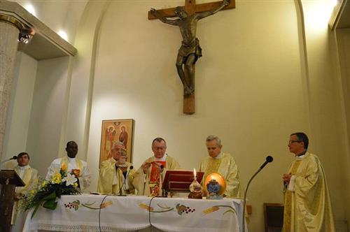 Sáng thứ ba, 29-9-2015, Đức Hồng y Pietro Parolin dâng thánh lễ Thiên thần Gabriel, bổn mạng của truyền thông ở Nhà nguyện của trụ sở Radio Vatican.