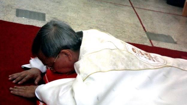 Dứt Kinh cầu các Thánh, các Đức giám mục thinh lặng đến đặt tay trên đầu vị tiến chức.